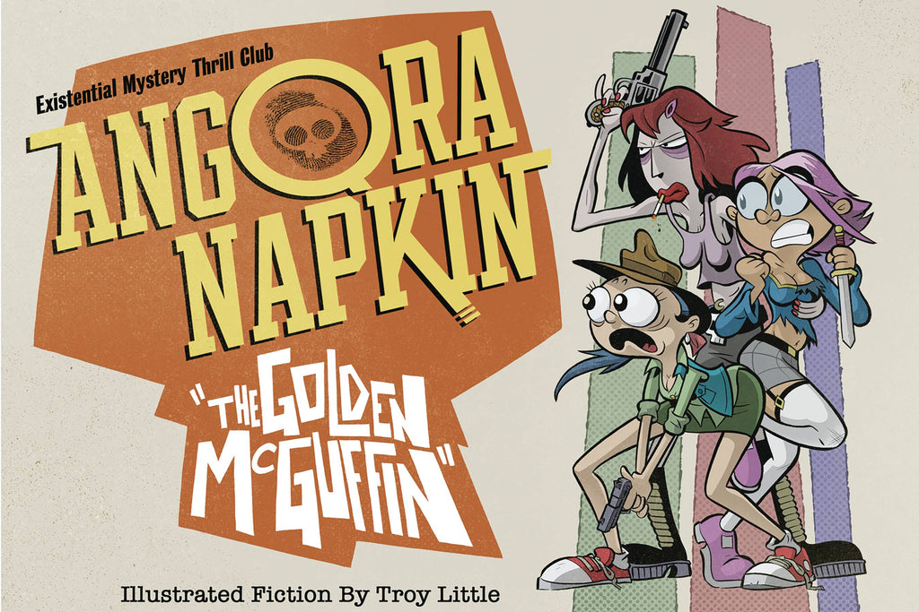 The Multiple Eisner nominated Angora Napkin series is back with a new solo adventure! Writer/artist Troy Little brings his manic cartooning energy back once more as Cuddle Core pop icons Angora Napkin open an Existential Detective Agency as a side hustle, because why not? Murder, mystery and mayhem ensue as the girls blindly flail their way through deadly mazes, sticky clowns and into the unforgiving frozen tundra of Toronto, Canada on a quest for the enigmatic Golden McGuffin!